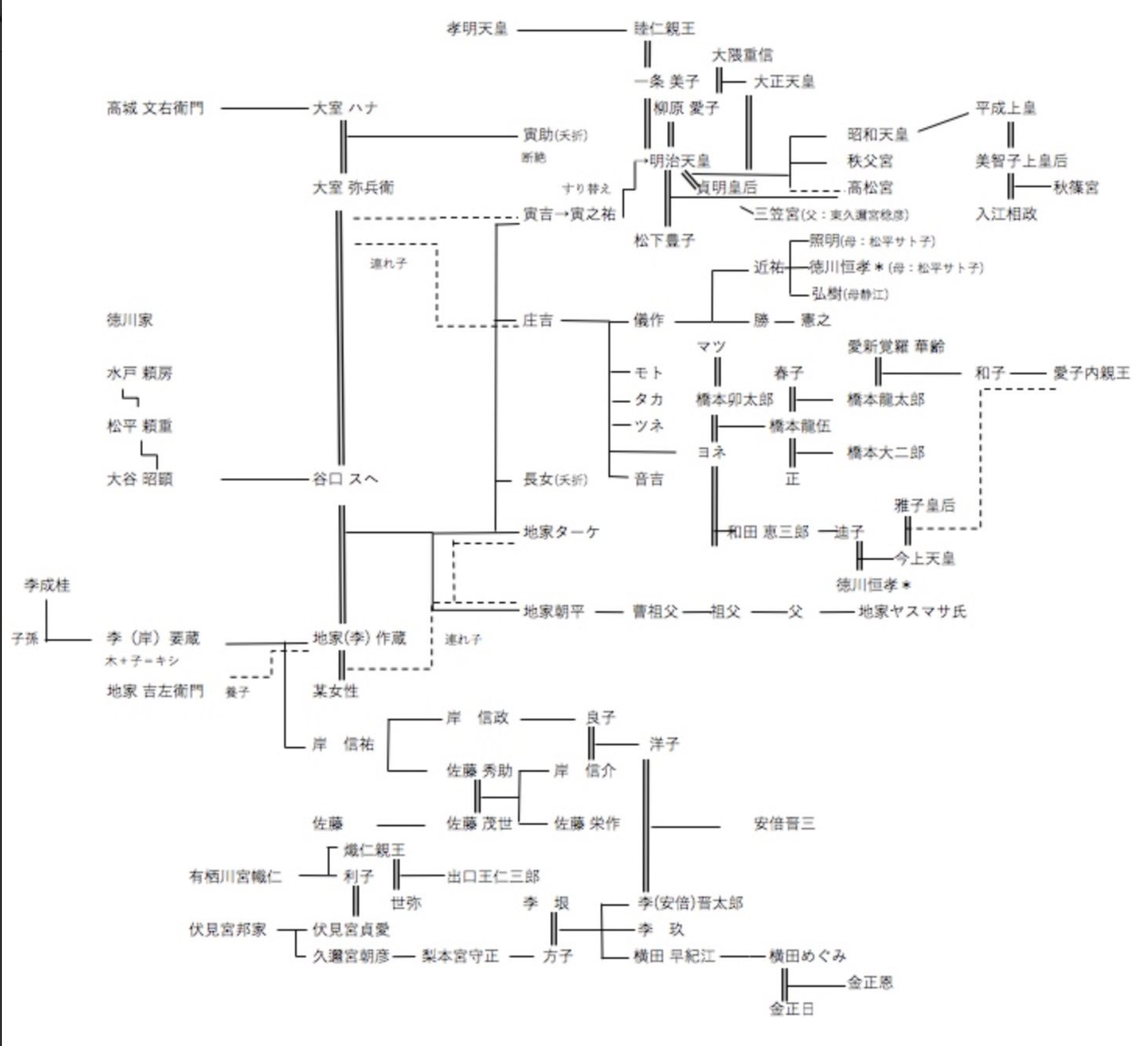 下の家系図をご覧ください。一番下のエリアに安倍晋三がいますが、父方の祖父は李氏朝鮮最後の王である高宗の息子の李垠で、母方の先祖もたどれば李氏朝鮮王族の子孫なのです。