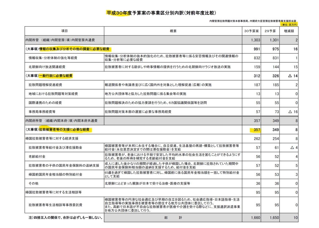 政府は「拉致問題対策本部」なる組織を内閣府に作り、残りの12人とその家族を「日本に取り返す」ために 2018年度には16.5億円もの予算を取りました。この予算、令和2年度の概算要求だと18.2億円に跳ね上がっていたりします。